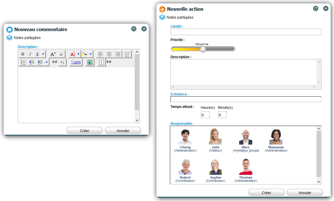 Des annotations typées plus ou moins structurées, du simple champ texte libre (Ex : annotation "commentaire"), au formulaire intégrant des traitements et des règles de validation (Ex : annotation "Action").